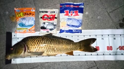 ニゴイ、スッポン、ヘラブナと釣れて、日没 電気ウキに交換し、2投目で久々の70オーバーが釣れました。