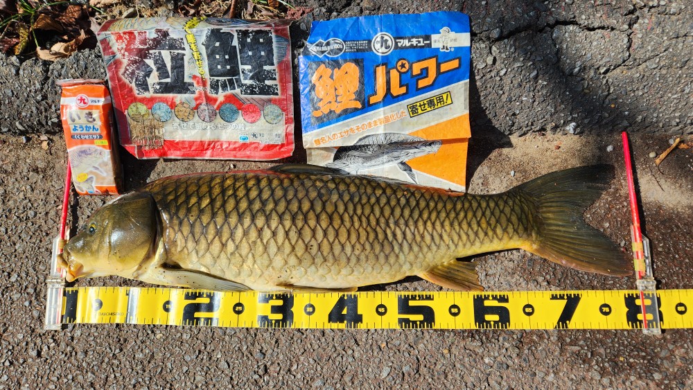 中古で手に入れた振り出しタイプのマッドドラゴンの前に腰を下ろし、ちょっぴりよそ見をしている13時過ぎに音も無く思いっきり下流方向にしなっていてフィッシュオン❗😅慌てて竿を取りファイト!!自転車が沈んでいる処めがけて一直線だがロッドを立て踏ん張る!!