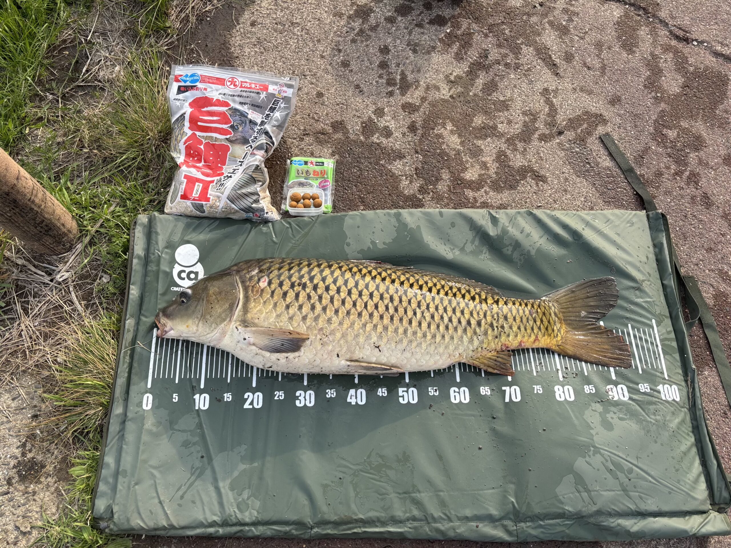 普段の食わせエサはコーンを使用しておりますが、今回はマルキューさんの「いもねり」を丸めて乾燥させたモノをヘアリグにしてトライしてみました。