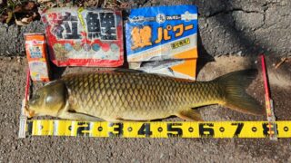 1.ハンドルネーム: 山崎和哉 様 2.釣行日時: 2025/10/7 3.場所(県/釣り場名): 千葉県/海老川 4.写真1枚添付   5.サイズ(cm): 80.5cm、 6.使用エサ(寄せエサ、くわせエサ): 【寄せエサ】 粒鯉、 鯉パワー 【くわせエサ】 いもようかん    7.使用タックル: 竿:カープロッド2.75LB 3.6m、 リール::4000番スピニングリールス、 道糸:PE3号・リーダー5号、 ハリス:ナイロン3号、 ハリ:管付鯉針10号、 仕掛け:ぶっこみ釣り 8.当日のご感想: 2ヶ月ぶりの釣行で、あっちこっちウロウロ……ようやく11時過ぎにポイントを決め釣り支度!バックに有ると思った仕掛けが無く😅……仕方無く2号の中通しオモリで仕掛けを作り投入! 中古で手に入れた振り出しタイプのマッドドラゴンの前に腰を下ろし、ちょっぴりよそ見をしている13時過ぎに音も無く思いっきり下流方向にしなっていてフィッシュオン❗😅慌てて竿を取りファイト!!自転車が沈んでいる処めがけて一直線だがロッドを立て踏ん張る!! 久方ぶりのやり取りを楽しみ80オーバーを確保ぉー!...