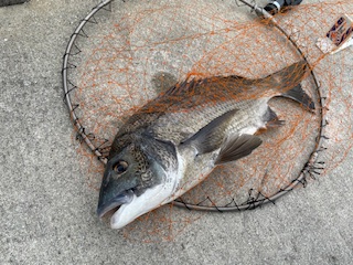 5.使用タックル: 竿:磯竿5.0m、 リール:スピニングリール2500番、 ウキ:寝ウキ、 道糸:3.0号、 ハリス:2.5号 1.5ヒロ、 ハリ:チヌバリ3号、 タナ:ハワセ