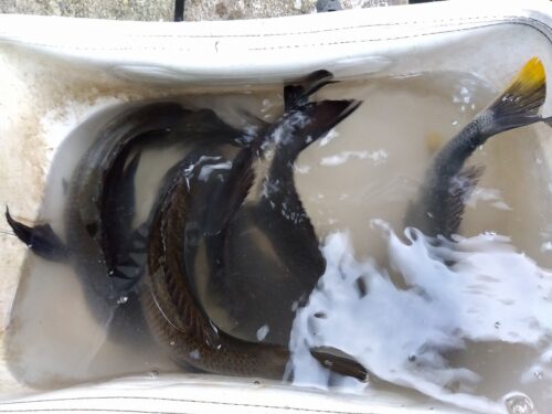 11時半ぐらいに食用エビを刺して投入したところ、寝ウキが立って消し込むような大きなアタリがあり、40cmほどの良型のチヌが釣れました。これ以降、1時間おきぐらいに35~40cmのチヌが釣れましたが同時にエサ取りのフグも釣れ、大きいものでは35cmぐらいのフグが釣れて取り込んで放流するのに往生しました。