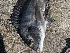 1.ハンドルネーム: シルバーブラック 様 2.釣行日時: 25年8月15日(金) 3.場所(県/釣り場名): 愛媛県/宇和海 波止場 4.使用エサ: 【ダンゴエサ】 波止ダンゴチヌ、 荒びきさなぎ、 押し麦、 アミエビ 【付けエサ】 ガツガツコーン、 くわせオキアミスーパーハード、 荒食いブラウン、 エサ持ちイエロー 5.使用タックル: 竿:磯竿5.0m、 リール:スピニングリール2500番、 ウキ:寝ウキ、 道糸:3.0号、 ハリス:2.5号 1ヒロ、 ハリ:チヌバリ3号、 タナ:ハワセ 6.当日のご感想: チヌの活性が悪い中、ワンチャンスをものできました。