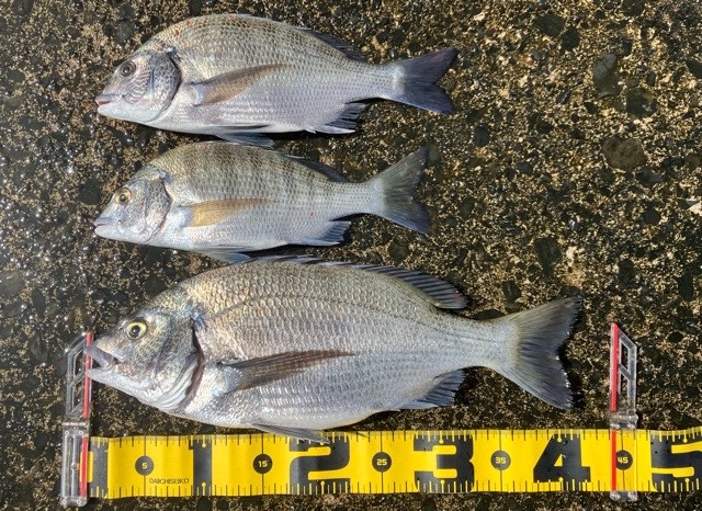 ところが今回は、遠投ポイントの表層にダツが回遊しており、様子が一変。ダツをかわすことができればチヌが釣れると予想し、コマセワークで対策を講じた結果、チヌを3枚釣り上げました。