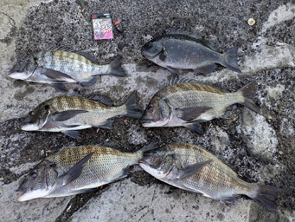 神奈川県/三浦半島 関東地区 2026.02.05 1.ハンドルネーム: ZERO 様 2.釣行日時: 2026年1月31日 3.場所(県/釣り場名): 神奈川県/三浦半島 4.写真1枚添付 5.使用エサ(マキエ、付けエサ): 【マキエ】 オキアミ3kg、 グレパワーV9(徳用)、 爆寄せグレ 各1袋 6.使用タックル: 道糸・ハリス:1.5号、 ウキ:G5、 ハリ:グレ針5号 7.当日のご感想: 前週より水温が下がったようで付けエサが残る事が多かったです。 メジナ狙いの釣行でしたがクロダイの方がよく釣れました。