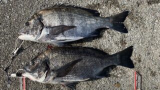 1.ハンドルネーム: RiverVillage 様 2.釣行日時: 2025年12月13日(土) 3.場所(県/釣り場名): 三重県/霞一文字堤 4.写真1枚添付 5.使用エサ(マキエ、付けエサ): 【マキエ】 オキアミ:3kg + チヌパワー:0.3kg + ナンバー湾チヌⅡ:3.5kg 【付けエサ】 生オキアミ + 食い渋りイエロー 6.使用タックル: 竿:磯竿0.6号5.3m、 リール:レバーブレーキ付きスピニングリール2500番、 道糸:ナイロン2号、 ウキ:棒ウキ5B、 ハリス:フロロカーボン1.5号、 ハリ:チヌ針3号、 ガン玉:4BG2+G2+G4 7.当日のご感想: 今年は本当にフグの多さに手を焼いています。例年の倍ぐらいフグに集られていると感じます。そのような中でしたが、コマセの使い方を試行錯誤して、どうにか2枚を釣り上げることができました。