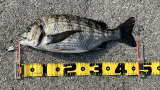 1.ハンドルネーム: RiverVillage 様 2.釣行日時: 2026年2月1日(日) 3.場所(県/釣り場名): 三重県/霞一文字堤 4.写真1枚添付 5.使用エサ(マキエ、付けエサ): 【マキエ】 オキアミ:3kg + チヌパワー:0.2kg + ナンバー湾チヌⅡ:3.5kg 【付けエサ】 生オキアミ + 食い渋りイエロー 6.使用タックル: 竿:磯竿0.6号5.3m、 リール:レバーブレーキ付きスピニングリール2500番、 道糸:ナイロン2号、 ウキ:棒ウキ5B、 ハリス:フロロカーボン1.5号、 ハリ:チヌ針3号、 ガン玉:3B2B+G4+G4 7.当日のご感想: 久しぶりの釣りでした。めちゃくちゃ寒かったです。 午前の3時間半の釣りで、アタリはたったの3回でした。潮流が不安定だったこともあり、あれやこれやと対策した結果、一枚を釣り上げることができました。