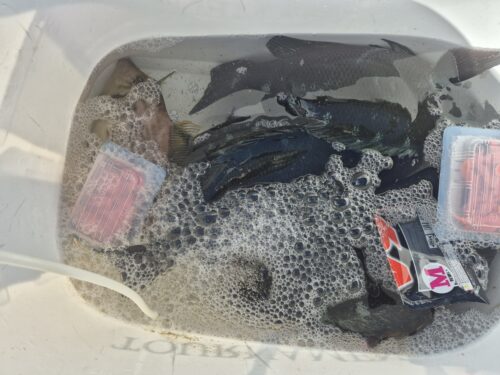 愛媛県/御五神 四国地区 2025.12.23 1.ハンドルネーム: ツチヤタカユキ 様 2.釣行日時: 2025.12.19 3.場所(県/釣り場名): 愛媛県/御五神 4.写真2枚添付 5.使用エサ(マキエ、付けエサ): 【マキエ】 グレパワーV9(徳用) 【付けエサ】 くわせオキアミV9(M) 6.使用タックル: 道糸・ハリス:1.5 号、 ハリ:5号 7.当日のご感想: 激流の中、V9の煙幕を見ながら微かな潜り潮を探しました。 V9の視認性に助けられた1日でした。最大44cm!