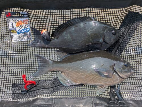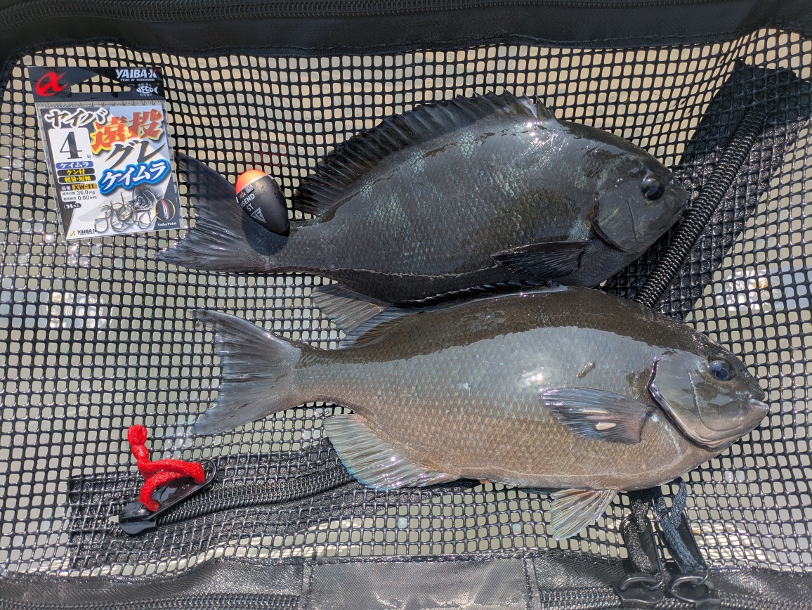前情報通り活性が低く付けエサが残ることが多かったですが、僅かな時合いで小型ながら2尾のメジナを釣ることができ入賞できました。