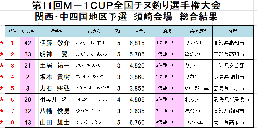 大会当日は43名が高知県須崎市須崎観光協会に集結。受付で抽選を終えた選手たちは1船4便に分かれ乗船。競技時間は担当役員が各船6時間の競技時間を設定、チヌ(キビレ含む)5尾以内の総重量の規定内で腕を競った。早朝は冷え込んでいたが、日中は日が昇り、釣り日和に恵まれた大会となった。釣果の方は半数近くが釣果を上げたが場所むらのある厳しい大会となった。各便船の上位2名、合計8名が、2026年9月25日(金)下津井にて行われる関西・中四国地区準決勝に駒を進めました。