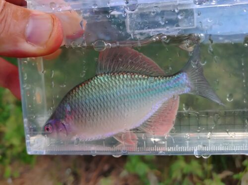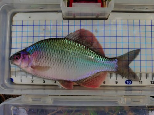 埼玉県/荒川水系 関東地区 2025.10.20 1.ハンドルネーム: tomtom 様 2.釣行日時: 2025年9月29日 3.場所(県/釣り場名): 埼玉県/荒川水系 4.写真2枚添付 5.使用エサ: 黄身練り 6.使用タックル: 竿:135cm自作タナゴ竿、 ウキ:自作ウキ、 ハリ:秋田狐1.5号 7.当日のご感想: アタリが少ない中を粘っていると、いきなり来ました。