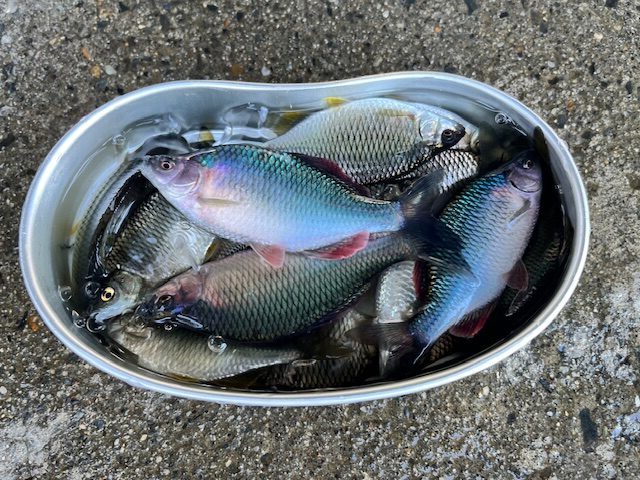 滋賀県/高島市 琵琶湖 近畿地区 2025.10.23 1.ハンドルネーム: かへるくん 様 2.釣行日時: 2025年10月8日 3.場所(県/釣り場名): 滋賀県/高島市 琵琶湖 4.写真1枚添付 5.使用エサ: タナゴグルテン、 赤虫 6.使用タックル: 竿:小物釣り用振り出し竿180 7.当日のご感想: 季節とともにカネヒラの付き場が変わってきています。 特にオスは浅場のサイトフィッシングのような感じでした。そろそろシーズン終了かも知れません。