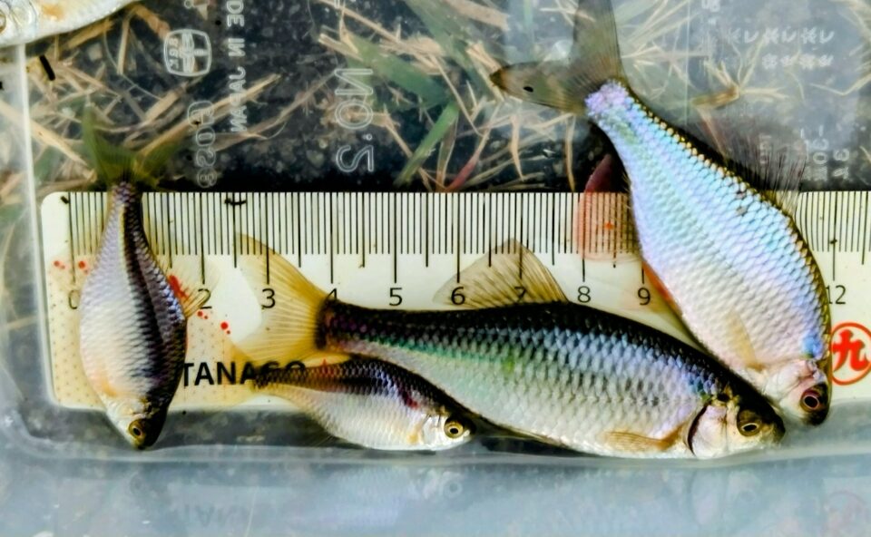 6.使用タックル: 竿:タナゴ竿70cm、 仕掛け:親浮き、シモリ5連、市販針