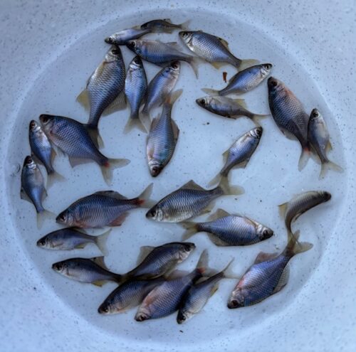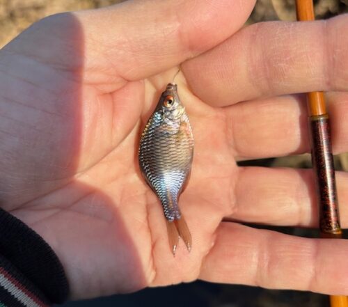 茨城県/牛久沼水系 ホソ 関東地区 2025.12.09 1.ハンドルネーム: タナゴ隊[オレンジ] 様 2.釣行日時: 2025年12月8日(月) 3.場所(県/釣り場名): 茨城県/牛久沼水系 ホソ 4.写真2枚添付 5.使用エサ: 「黄身練り」付属スプーン1杯に水少々 6.使用タックル: 竿:和竿2尺6寸(78cm)、 仕掛け:山吹浮き+トンボ+シモリ仕掛け 7.当日のご感想: 今日も越冬でにぎわっているホソでタナゴ釣り。 クチボソと小鮒と闘いながらもまずまずの釣果でした。