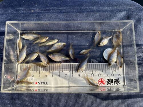 埼玉県/某用水路 関東地区 2026.03.23 1.ハンドルネーム: さとやん 様 2.釣行日時: 2026年3月21日(土) 3.場所(県/釣り場名): 埼玉県/某用水路 4.写真1枚添付 5.使用エサ: タナゴグルテン競技用:付属スプーン1杯 + 水1.2杯 6.使用タックル: 竿:タナゴ竿80cm、 仕掛け:自作シモリ仕掛け、 ハリ:研ぎ針 7.当日のご感想: 風が強くシモリが見えづらかったが外道がいなかったのは良かった