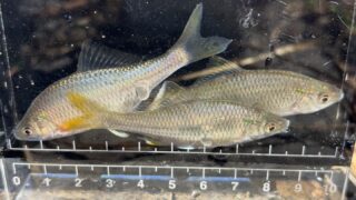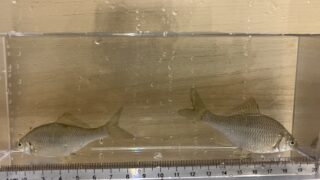 1.ハンドルネーム: tomozo 様 2.釣行日時: 2025年10月11日 3.場所(県/釣り場名): 滋賀県/琵琶湖 南湖西岸 4.写真2枚添付 5.使用エサ: タナゴグルテン(水少し多め) 6.使用タックル: 竿:6尺、 仕掛け:手作り仕掛け 7.当日のご感想: 見える範囲内の魚は婚姻色が目立つ個体が多いです。 サイズは10cmクラスが混じりましたが数は減少傾向でシーズン終盤に近づいている模様です。