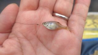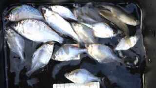 1.ハンドルネーム: tomozo 様 2.釣行日時: 2025年10月11日 3.場所(県/釣り場名): 滋賀県/琵琶湖 南湖西岸 4.写真2枚添付 5.使用エサ: タナゴグルテン(水少し多め) 6.使用タックル: 竿:6尺、 仕掛け:手作り仕掛け 7.当日のご感想: 見える範囲内の魚は婚姻色が目立つ個体が多いです。 サイズは10cmクラスが混じりましたが数は減少傾向でシーズン終盤に近づいている模様です。